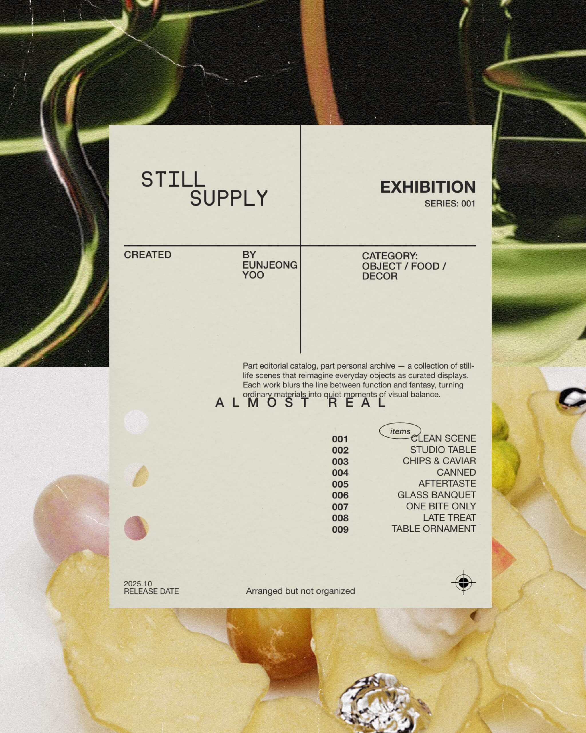 Part editorial catalog, part personal archive — a collection of still-life scenes that reimagine everyday objects as curated displays. Each work blurs the line between function and fantasy, turning ordinary materials into quiet moments of visual balance.