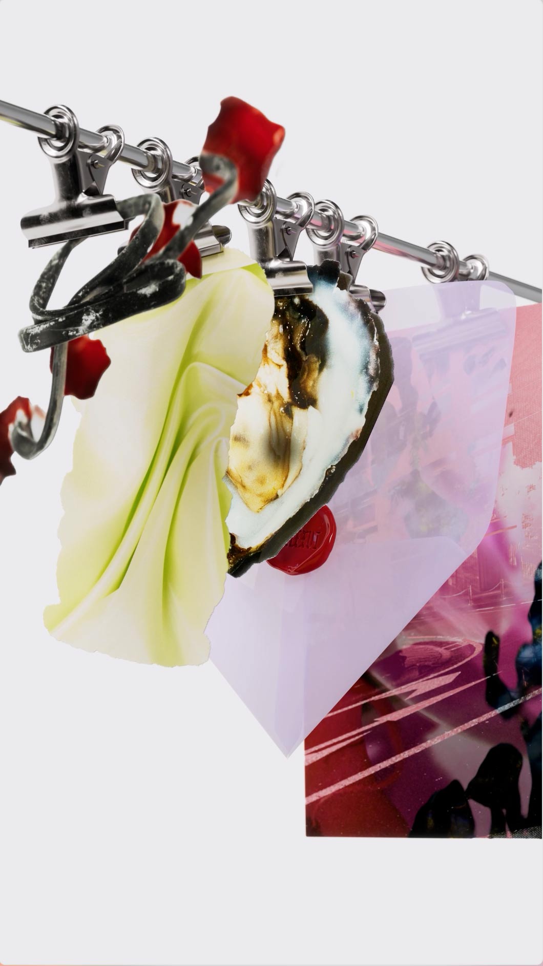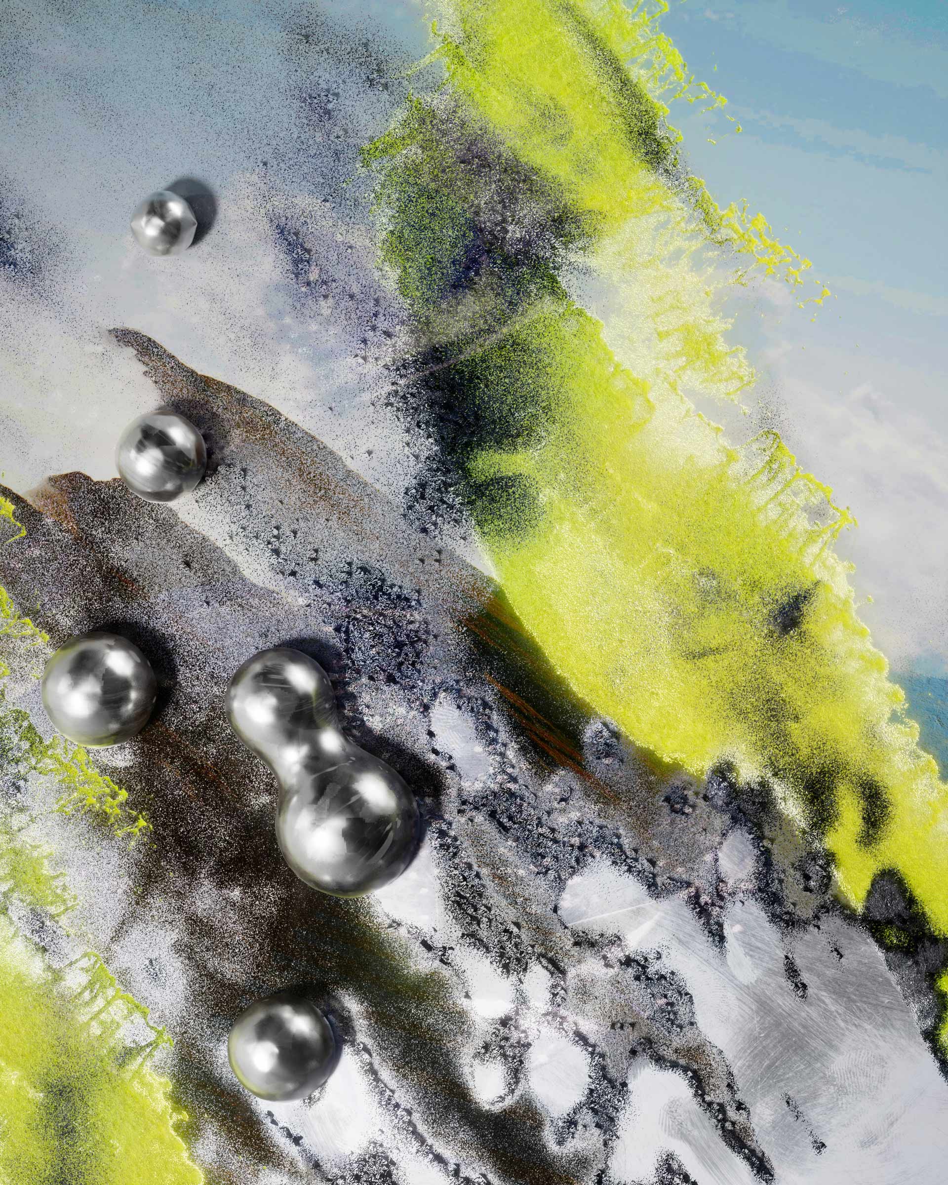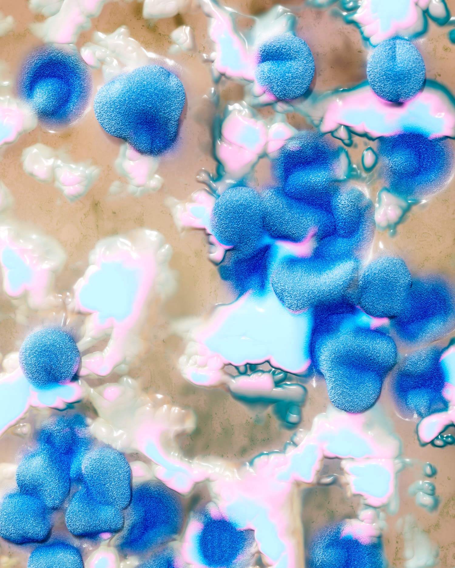 An exploration of texture through constructed digital materials and visual collage. Layered surfaces, clustered forms, and fluid transitions are composed into abstract fields. Elements are arranged, overlaid, and recombined to build depth and visual tension. The work focuses on how material qualities — light, reflection, density — can be abstracted and reorganized within a digital space.